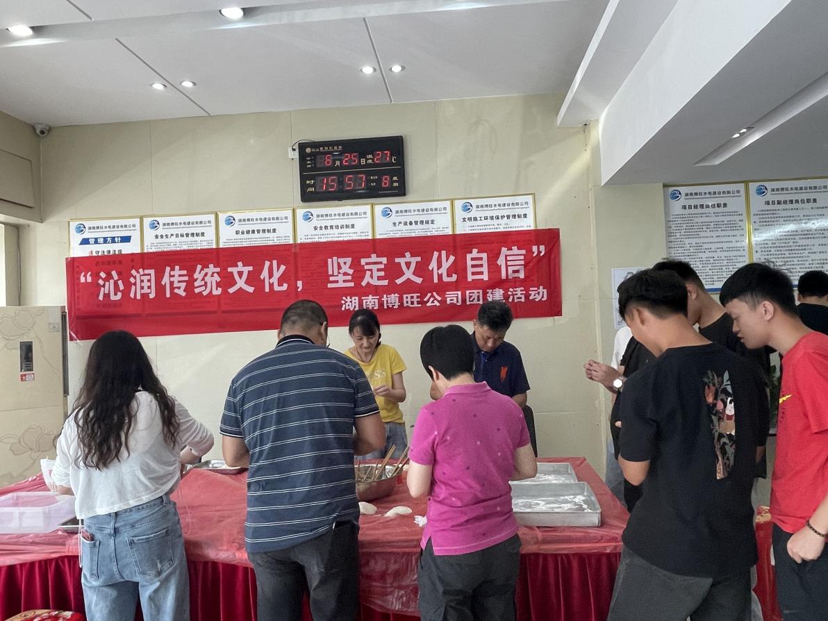 2023年6月,湖南博旺水电建设有限公司成立十周年之际,为打造一支有凝聚力、向心力的队伍,公司开展了为期三天的团建活动。团建地点为零溪河慈利县三期治理工程项目所在地慈利县零溪镇,活动内容有包饺子、赵家垭水库参观、工地现场观摩、素质拓展等。